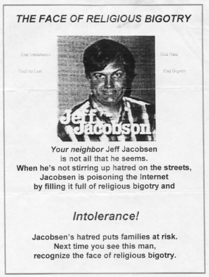 LEARN MORE ABOUT JEFF: See the "dead agent" flyer Scientology distributed in Jeff's neighborhood. Jeff speaks at Clearwater city commission meeting 5/17/01Jeff discriminated against for attempting to buy memorial bricks in memory of Lisa McPherson. Read the correspondence 3/01 Related page Jeff speaks at Clearwater city commission meeting 3/01/01 Jeff speaks at Clearwater city commission meeting 8/17/00 The Hubbard Is Bare, history of Hubbard's ideas [link] You can write to Jeff at jeffjacobsen@lisamcpherson.org/LMT Return to LMT Home Page |